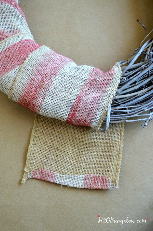 Wrap the pretty red and white striped burlap around 1/2 of the wreath like this. Tuck the end under and secure it with hot glue.
