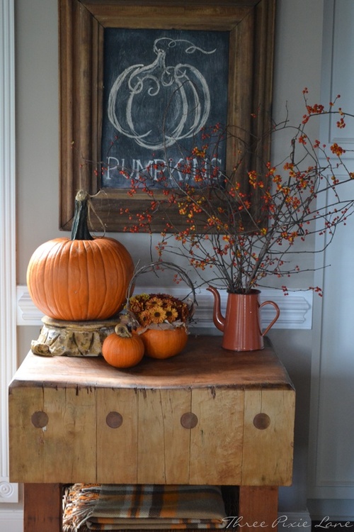 Pumpkins stacked in a vase of colorful flowers. I’d love this in an entry hall, on a table or as a pretty hostess gift 🙂