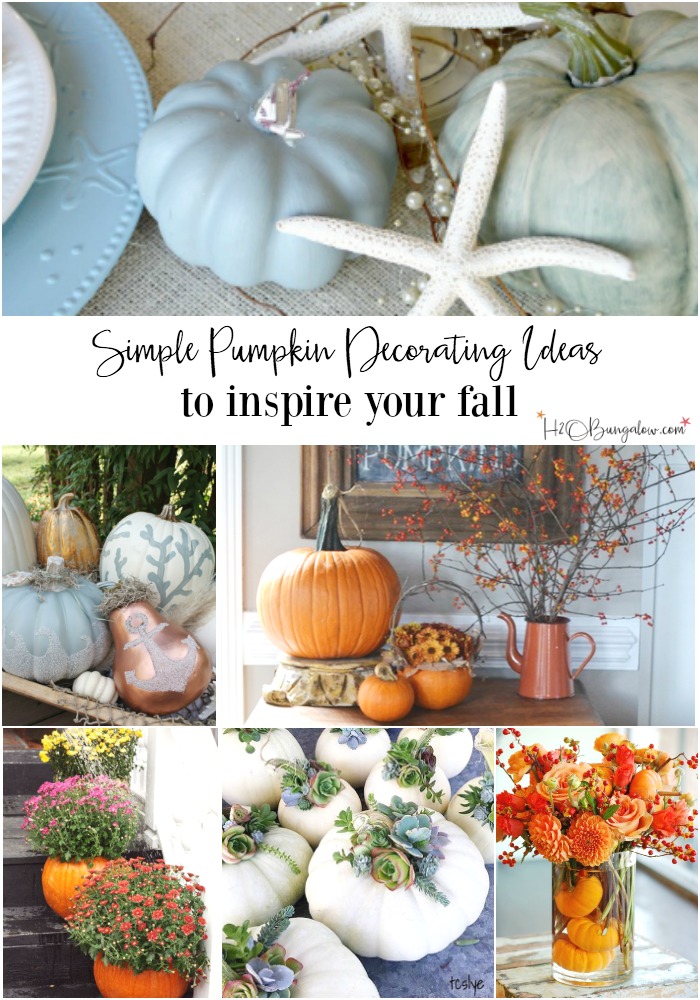 My big plan for this week was to share a pumpkin decorating DIY project but since I am still on the road in Vermont, as I write this actually, it just didn’t happen. I’m still working in the background and look forward to sharing some fun news with you soon. In the meantime, I thought I’d share a few of my favorite pumpkin decorating inspiration photos. If you need more inspiration, check out my Coastal Fall Decor Ideas.
