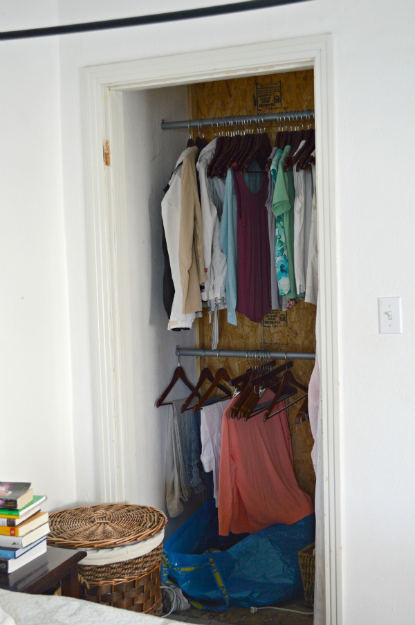 This make-shift closet was actually one of the doorways to our bedroom. The day we moved in, DH and I stood in this spot when he said “hmm, have you noticed we don’t have a door to our bedroom?” I turned the little hallway into a closet by closing it off.