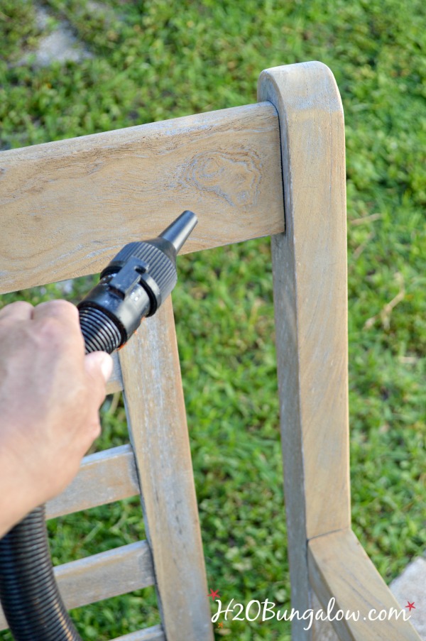 Sawdust was everywhere after sanding down the teak wood. On me, the furniture, in cracks and crevices. The easiest way to clean it all off was to use the air hose and attachment on my Finish Max Pro Paint Sprayer. It has a powerful blast of air that took care of most of the dust. I gave each piece a once over with a clean painters rag to remove any last bit of dust left.