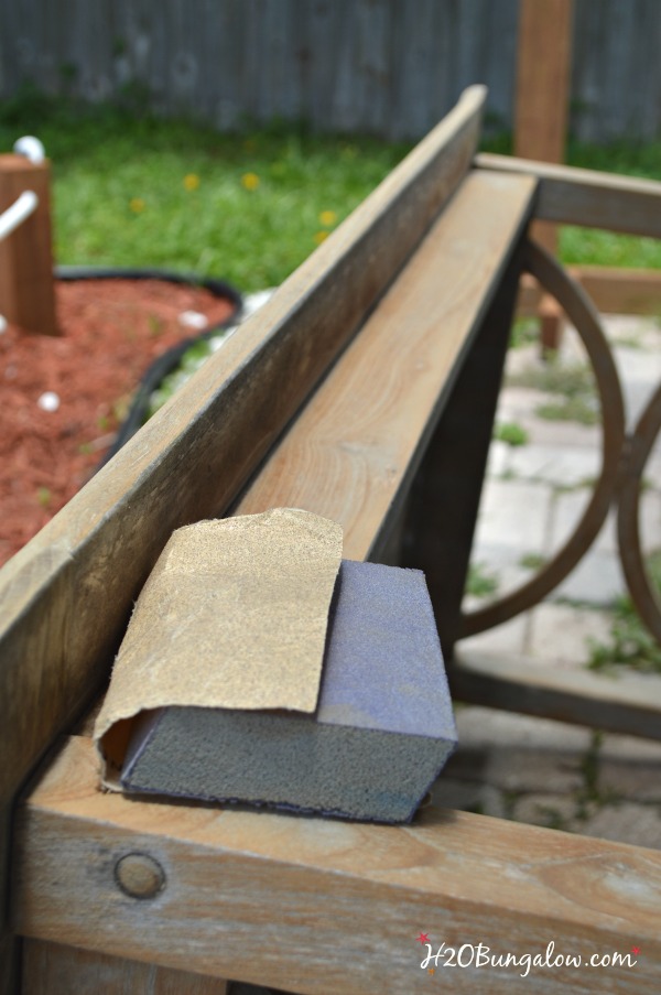 Start by sanding down the weathered areas of the wood to expose a fresh surface. My 5′ orbital sander was the perfect size and power to remove the top layer of damaged wood quickly. It worked best on horizontal surfaces. The hand sander was perfect on horizontal surfaces and corners. A piece of sandpaper wrapped round a sanding block is a good way to get hard to reach places like in between slats and decorative areas.