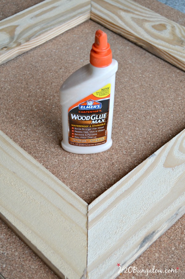 Cut the board into 4 pieces with a compound miter saw set to a 45 degree angle. I knew I wanted the frame to have a 13″ opening so I measured the inside cut at 13″. I used my combination square to mark the cut line for the angle and then glued the edges together.