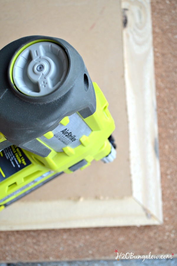 Cut a piece of ready-made chalkboard with a jig saw to fit just over the inside frame edges. Give yourself plenty of overlap, at least 1 1/2 to 2″. The jigsaw will not cut a pretty edge on the chalkboard and you’ll want plenty of area to attach the frame. Home Depot carries 2 x 4 sheets of this for about $8 a sheet. You can make lots of chalkboard gifts with one sheet! I attached the chalkboard to the back of my wood frame with my Ryobi Airstrike nail gun and 3/4″ brad nails.