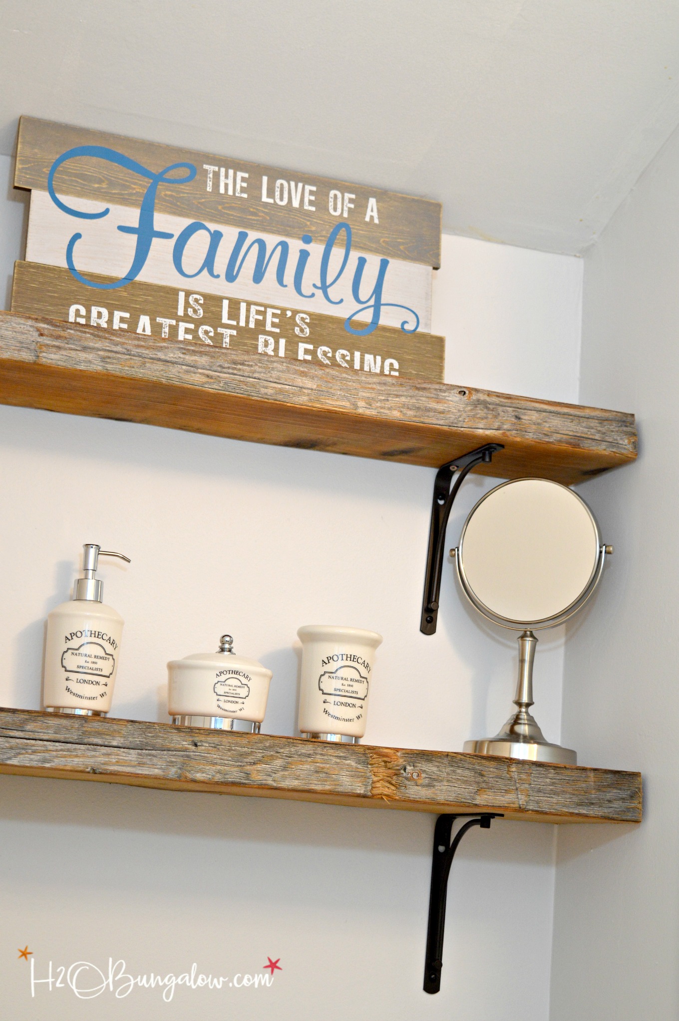 Replaced the old oak cabinet with reclaimed wood shelves like the ones I used in my DIY Reclaimed Wood Kitchen Shelves. These were just one of the many Creative DIY Shelving Ideas for Organizing and Styling your Home that I’ve shared.