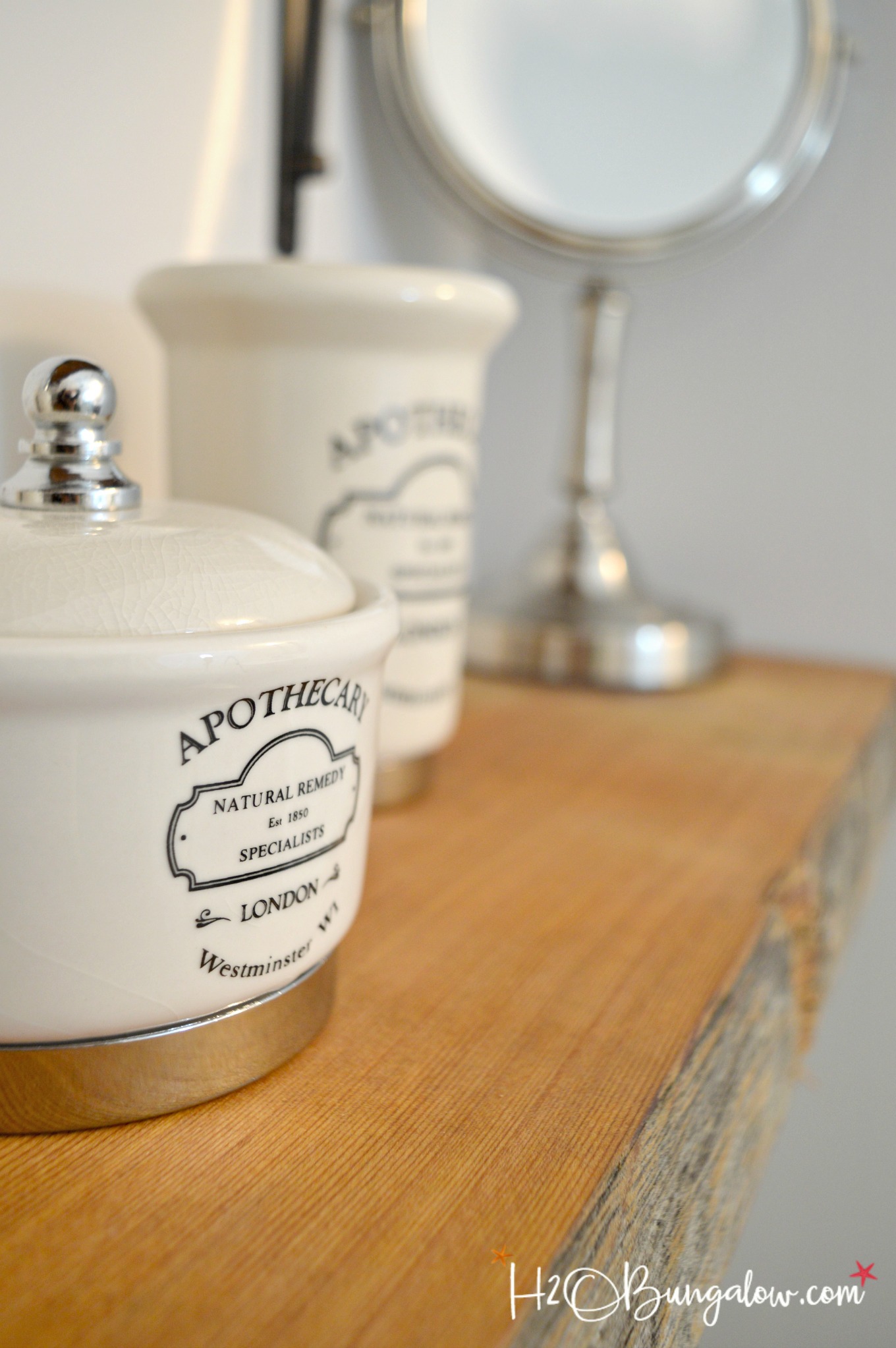 I so need one of those paint sticks! Your bathroom looks great – love the new vanity color and don’t get me started on those live edge shelves!