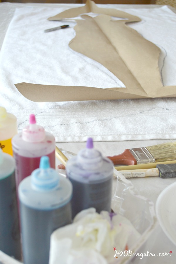 Cover a work area or table in plastic. I made a pattern of large mermaid on brown craft paper. You’ll save time by folding the paper in half, drawing one side, cut your pattern out and unfold. Trace the pattern onto a white pre-washed beach towel with a Sharpie.