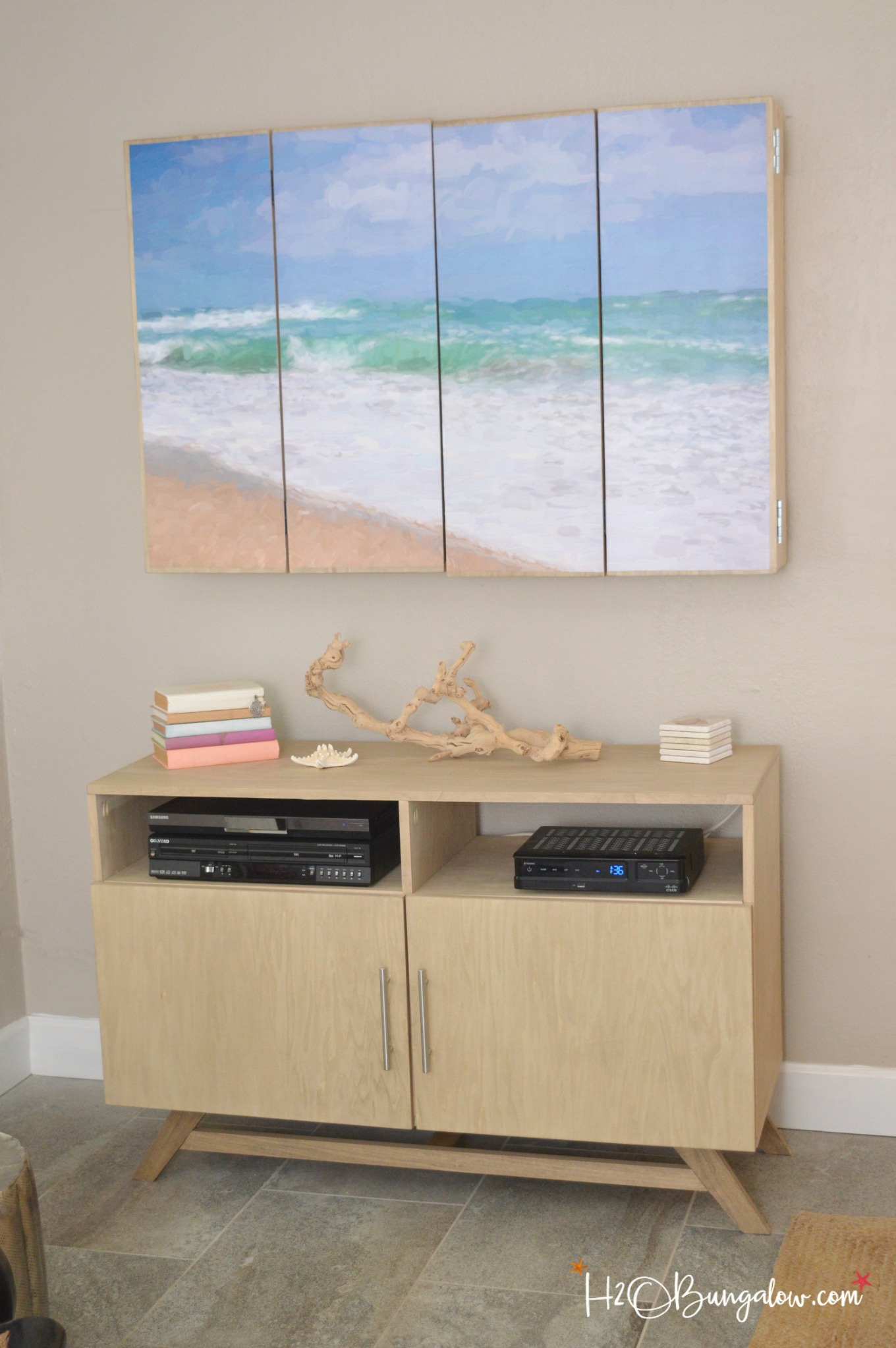 You can dilute like products, in other words you can water to water based stain or mineral spirits to an oil based stain. I used mineral spirits mixed with a beautiful oil based aged wood stain to dilute the color for this Crate and Barrel inspired finish on my DIY Media Console and Wall Mounted TV Cabinet.