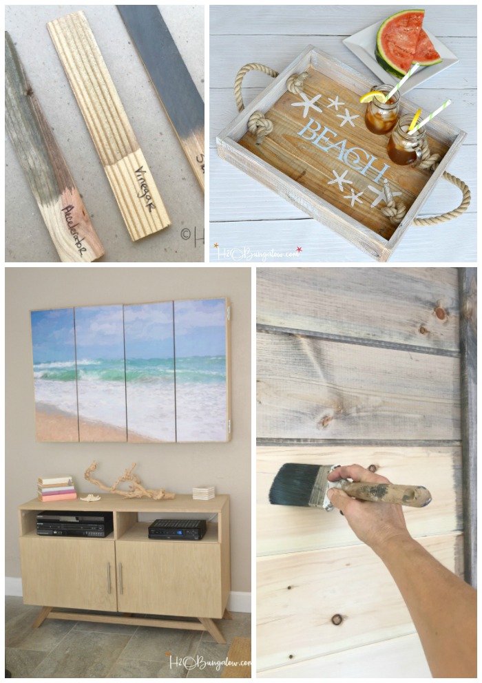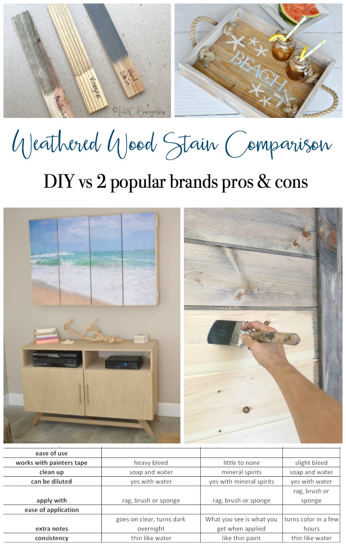 I compared three popular ways to age and weather wood, Rust-oleum’s Weathered Gray Wood Stain, Varathane’s Weathered Wood Accelerator and my DIY Aged Wood Recipe. You’ll find the recipe to my DIY Weathered Wood Stain, in my post How to Tea Stain Wood, (adding the tea is optional and was left out for this comparison).