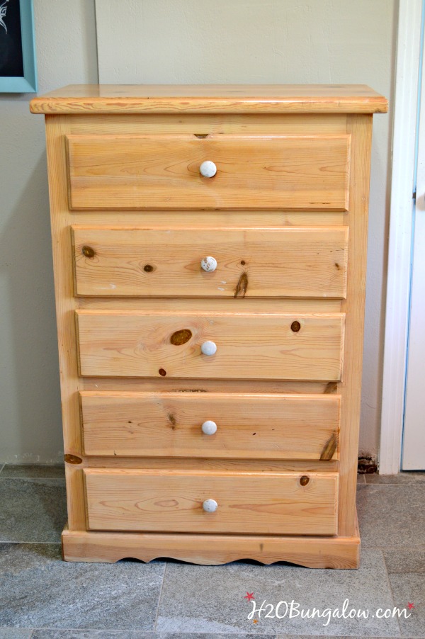 Last year I saw a piece of furniture that was distressed to the hilt. It was one of those pieces that stays in your head until the right moment comes along and the idea/want resurfaces. This plain dresser has followed me for over 20 years. I had a bedroom set made for my daughters when they were little. Two dressers, a shelf and bunk beds. My daughter has the mate to my dresser and we redid that a few years ago in a glam style for her in one of my really early posts. The bunk beds and little shelf have moved on, and I still have one of the dressers and it was a perfect candidate for my distressed damask stencil dresser project.