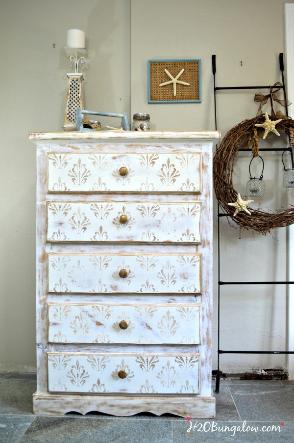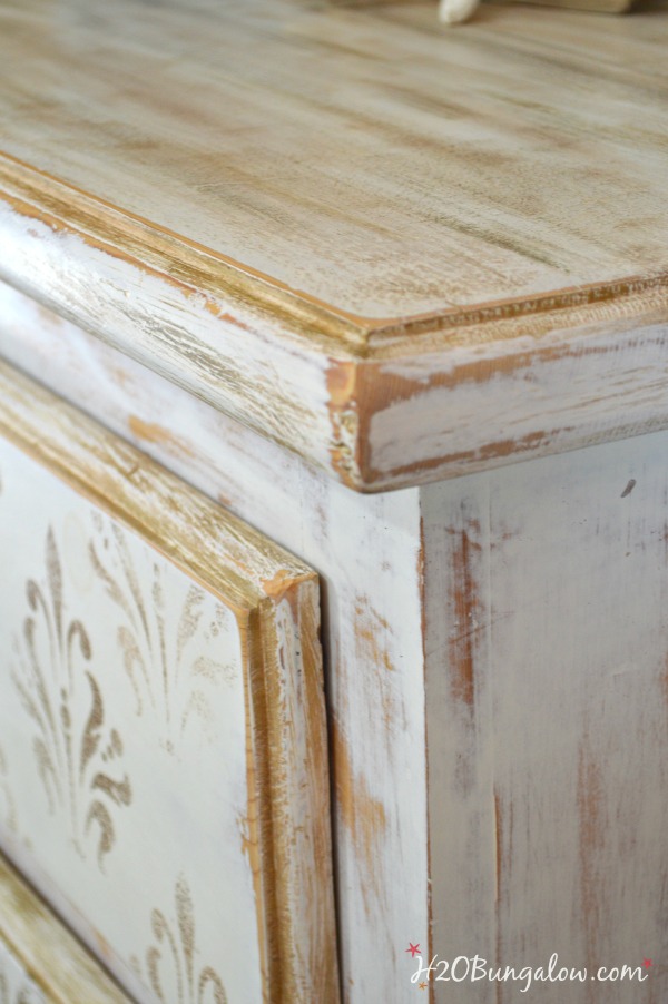 You gave this a totally different look! The stencil and gold paint along with distressing make this a glam piece that I know you will enjoy using for many more years.