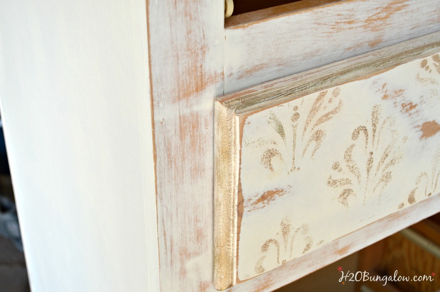 Then I started distressing the heck out of this baby. I used a wet rag and a lot of elbow grease to wet sand the daylights out of the body. The gold in the stencil will bleed into the surrounding paint if you try to wet sand over the stencil creme. The drawers were hand sanded with 220 and 320 grit sandpaper.