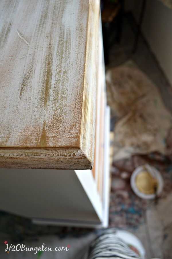 Without a plan in mind, I added the brushed gold to the dresser top and base trim of the dresser. My biggest challenge was keeping straight lines across to keep the effect I wanted. Get this effect with a mostly dry brush, just like when you stencil, and work it back and forth in straight lines across your surface. It’s a good finish to help hide nicks and dings in wood.