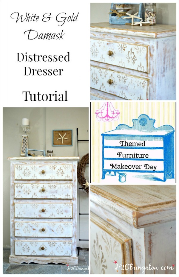 It’s Themed Makeover Day! Whoohoo! One of the best perks of belonging to this crazy talented group of furniture refinishing bloggers is the creative licence I get to take every month when I churn out a new themed makeover. Today’s theme? Distressed. Holy cow was this one fun! I made this white and gold distressed damask dresser and love how my plain dresser took on a vintage washed out look.